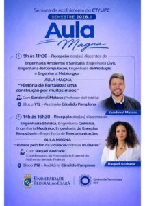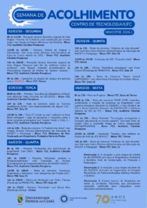 Informamos que, no período de 2 a 6 de março de 2026, será realizada a Semana de Acolhimento ao Discente do Centro de Tecnologia (CT).